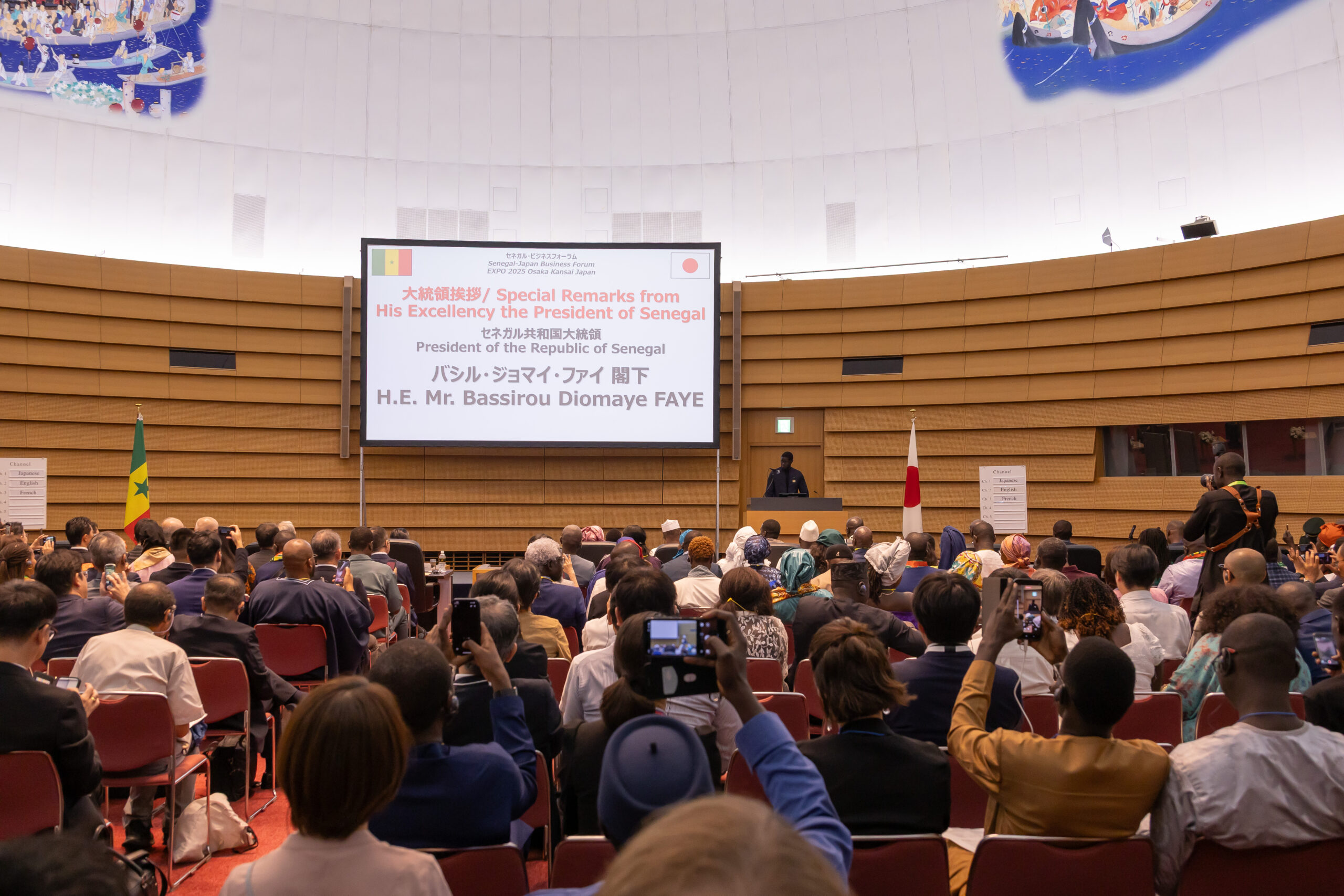 大阪・関西万博におけるセネガル共和国のナショナルデーを記念し、セネガル政府と独立行政法人日本貿易振興機構(JETRO)の共催によるセネガル・ビジネスフォーラムが開催されました。セネガルの大統領閣下をはじめとする要人を迎えし、日本企業等によるパネルディスカッションを交えながら、セネガルの経済・投資機会を紹介されました。フォーラム後には交流会も開催され、セネガルと日本の連携を深める機会となりました。
