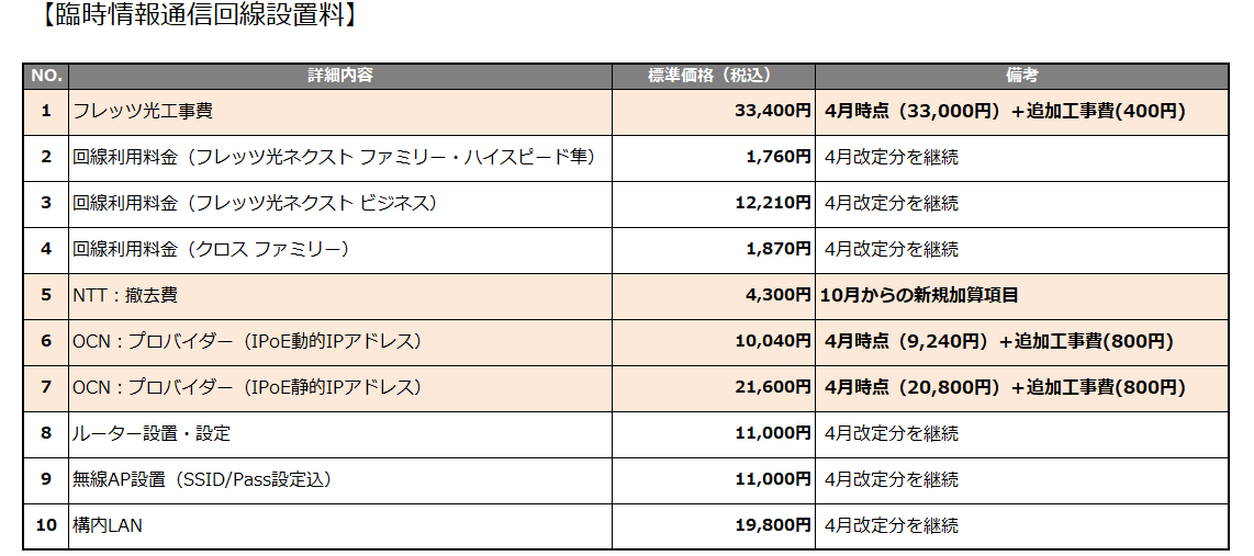 臨時情報通信回線設置料につきましては、従来、お客様にご利用いただきやすい価格で提供してまいりましたが、通信業者より工事費用の追加等の各種の申し入れがございまして、現在の価格での提供を継続することは困難となりました。つきましては、お客様にご負担をおかけすることになり、恐縮に存じますが、2026 年 10 月 1 日開催の催事から、下記のとおり臨時情報通信回線設置料を改定させていただきます。 お客様におかれましては、事情ご勘案の上、ご理解賜りますようどうぞよろしくお願い申し上げます。